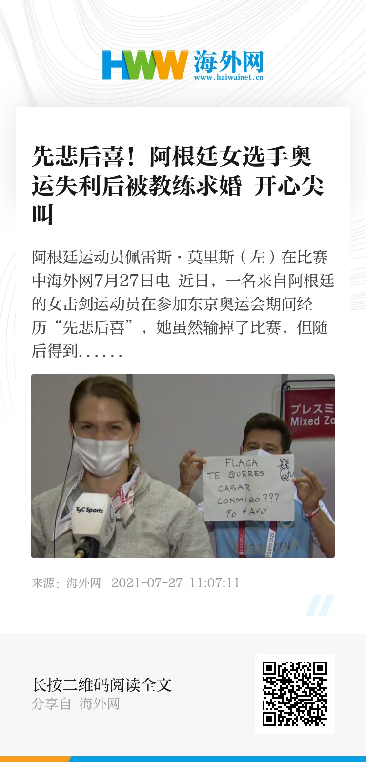海外网7月27日电 近日,一名来自阿根廷的女击剑运动员在参加东京奥运会期间经历“先悲后喜”,她虽然输掉了比赛,但随后得到了教练兼男友的求婚,此前二人已相恋17年。