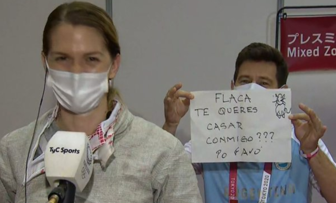 据美国有线电视新闻网26日报道,当地时间26日,36岁的阿根廷运动员佩雷斯·莫里斯在女子佩剑比赛中以12比15不敌匈牙利选手。她在赛后接受采访时,教练兼男友卢卡斯·沙索多在她背后举起了写有“你想嫁给我吗?”的一张大纸。经记者提醒后,莫里斯转身后发现了这一惊喜,她激动尖叫,迅速接受了沙索多的单膝跪地求婚,二人随后拥抱亲吻。