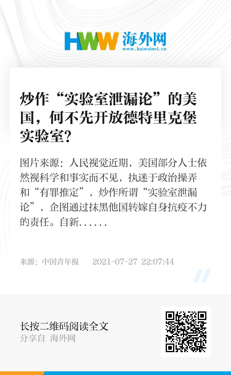 中国支持世卫组织在全球范围内开展新冠病毒溯源研究,但不应只针对中国,而是要全面彻查包括美国德特里克堡生物实验室在内的所有相关实验室。既然美方如此执着于病毒溯源和生物实验室的问题,中国希望美国能“推人及己”,做到如下几点:一是立即邀请世卫组织专家赴美调查,彻查美军德特里克堡基地;二是切实回应国际社会的关切,及早披露2019年7月弗吉尼亚州北部开始出现不明原因的呼吸系统疾病、威斯康星州等地暴发大规模“电子烟疾病”等相关病例的详细数据和信息;三是尽快开放美国散布全球的生物实验室,对美国境内外的生物军事化活动作出全面澄清。