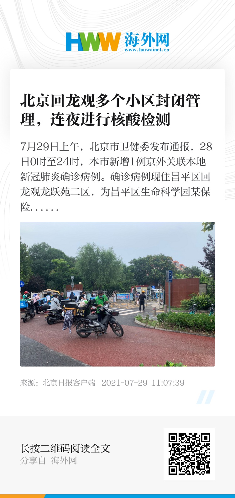 7月29日上午,北京市卫健委发布通报,28日0时至24时,本市新增1例京外关联本地新冠肺炎确诊病例。确诊病例现住昌平区回龙观龙跃苑二区,为昌平区生命科学园某保险集团员工。