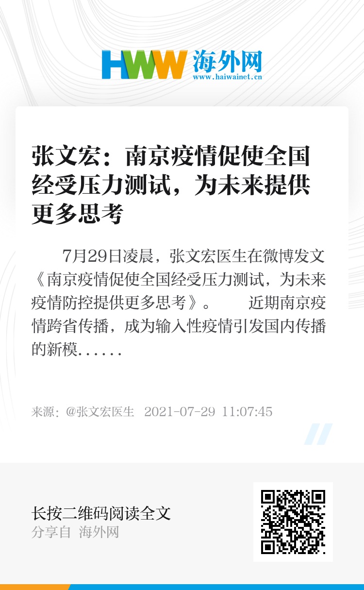 7月29日凌晨,张文宏医生在微博发文《南京疫情促使全国经受压力测试,为未来疫情防控提供更多思考》。