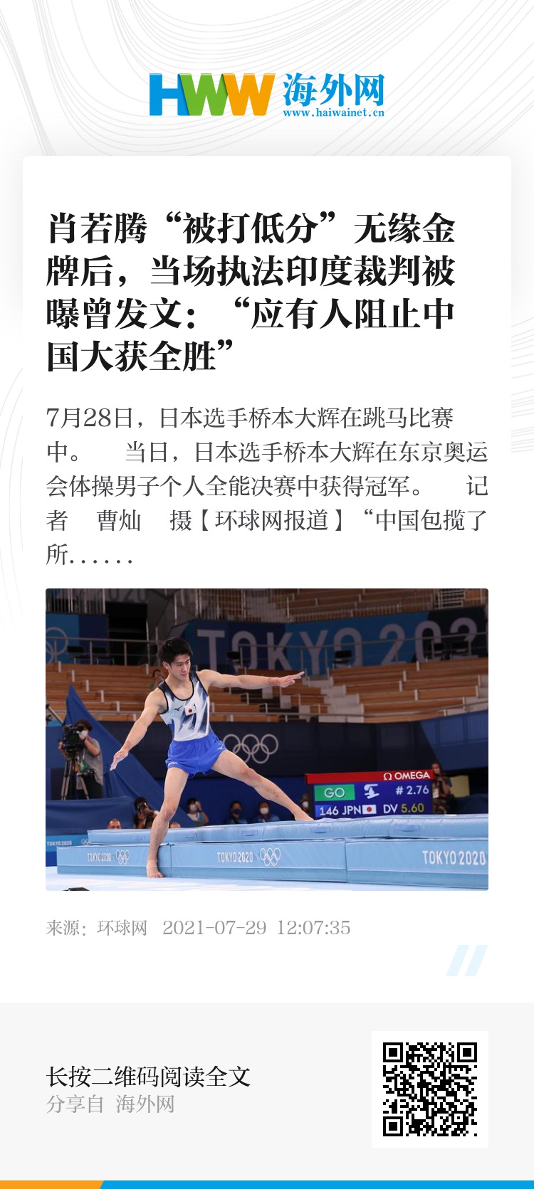 【环球网报道】“中国包揽了所有金牌!应该有人阻止他们大获全胜。”在中国男子体操运动员肖若腾“被打低分”无缘金牌后,有网友爆料称当天比赛中跳马项目的一位印度裁判2019年曾在推特上发过这样一条推文。