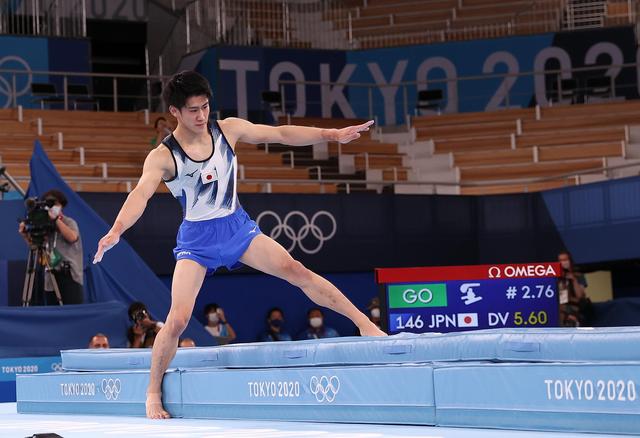 当地时间2021年7月28日,日本东京,日本选手桥本大辉在体操男子全能决赛跳马比赛中,落地时没有站稳,一只脚直接踩到了垫子外。