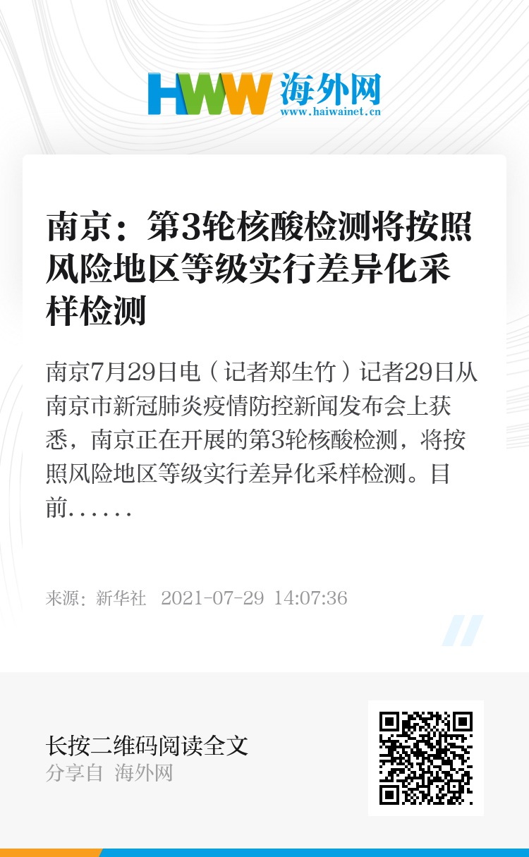 新华社南京7月29日电(记者郑生竹)记者29日从南京市新冠肺炎疫情防控新闻发布会上获悉,南京正在开展的第3轮核酸检测,将按照风险地区等级实行差异化采样检测。