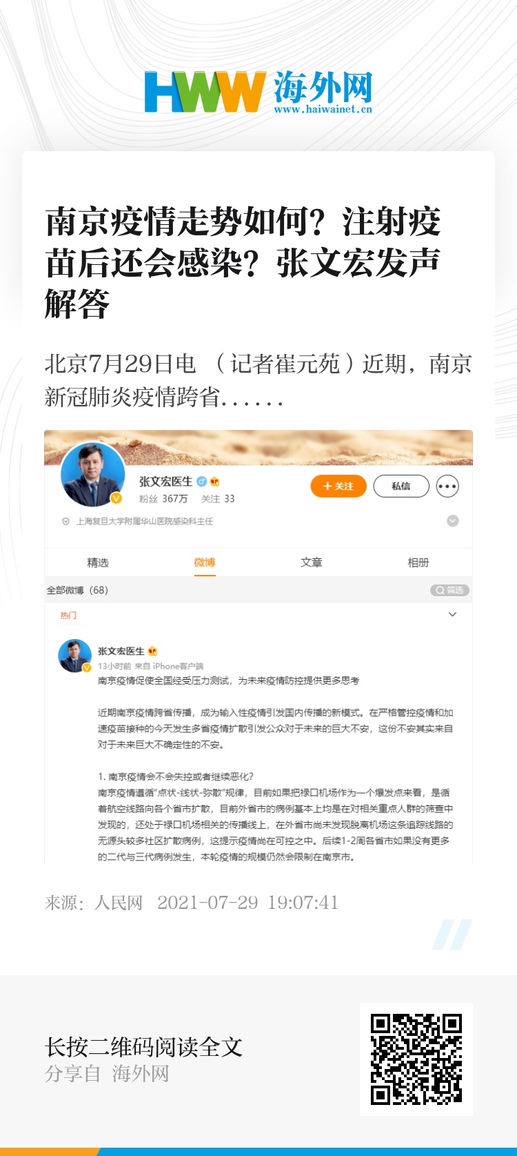 人民网北京7月29日电 (记者崔元苑)近期,南京新冠肺炎疫情跨省传播引发高度关注。7月29日凌晨,复旦大学附属华山医院感染科主任张文宏发微博表示,南京疫情促使全国经受压力测试,同时也为未来疫情防控提供更多思考。针对公众关心的问题,张文宏进行了分析和解读。