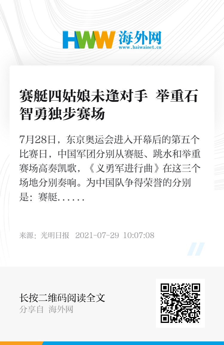 7月28日,东京奥运会进入开幕后的第五个比赛日,中国军团分别从赛艇、跳水和举重赛场高奏凯歌,《义勇军进行曲》在这三个场地分别奏响。为中国队争得荣誉的分别是:赛艇女子四人双桨的中国组合崔晓桐、吕扬、张灵和陈云霞,跳水男子双人三米板的谢思埸和王宗源组合,男子举重73公斤级的石智勇。石智勇还以364公斤创造了新的世界纪录。这也是东京奥运会举重赛场诞生的第一个世界纪录。