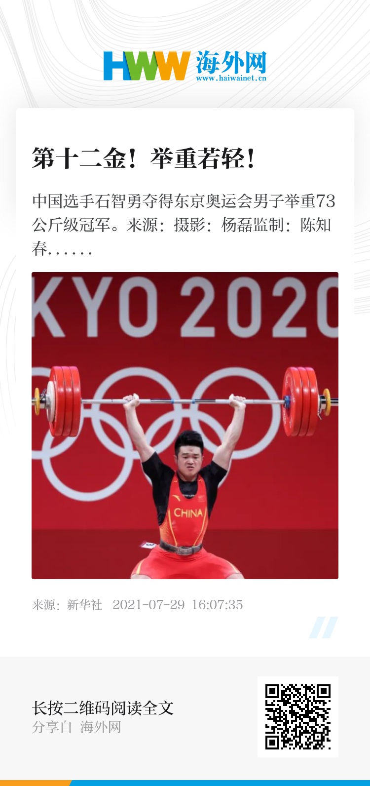 中国选手石智勇夺得东京奥运会男子举重73公斤级冠军。