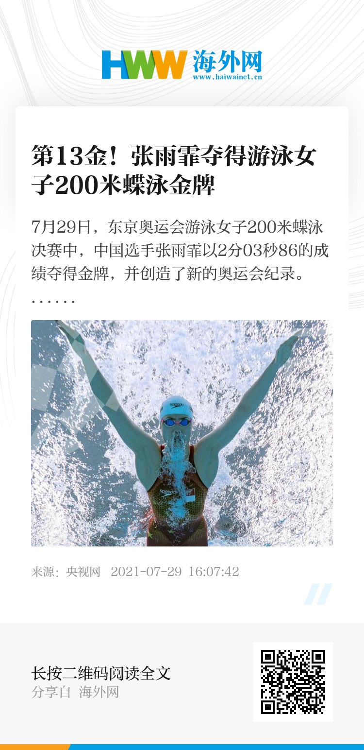 7月29日,东京奥运会游泳女子200米蝶泳决赛中,中国选手张雨霏以2分03秒86的成绩夺得金牌,并创造了新的奥运会纪录。