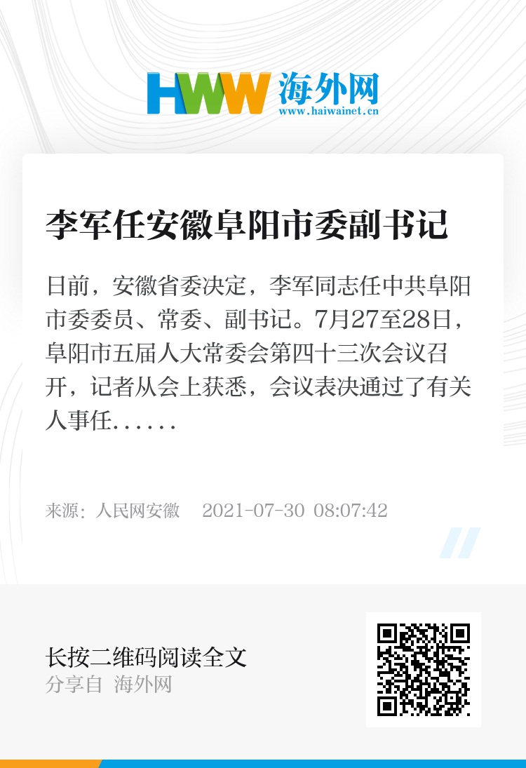 日前,安徽省委决定,李军同志任中共阜阳市委委员、常委、副书记。