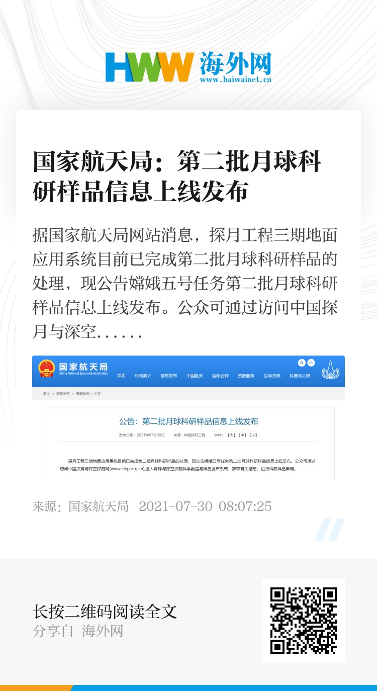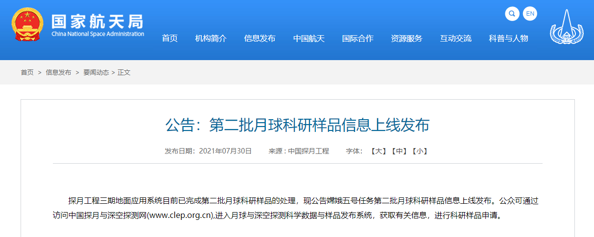 据国家航天局网站消息,探月工程三期地面应用系统目前已完成第二批月球科研样品的处理,现公告嫦娥五号任务第二批月球科研样品信息上线发布。公众可通过访问中国探月与深空探测网(www.clep.org.cn),进入月球与深空探测科学数据与样品发布系统,获取有关信息,进行科研样品申请。