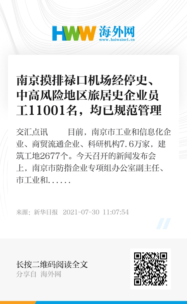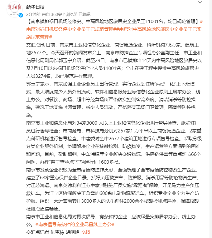 交汇点讯 目前,南京市工业和信息化企业、商贸流通企业、科研机构7.6万家,建筑工地2677个。今天召开的新闻发布会上,南京市防指企业专项组办公室副主任、市工业和信息化局副局长郭玉宁介绍,截至29日,南京市已摸排出14天内中高风险地区旅居史以及7月10日以来禄口机场经停企业人员11001名;全市在建工程中摸排中高风险旅居史人员3274名,均已规范进行管理。