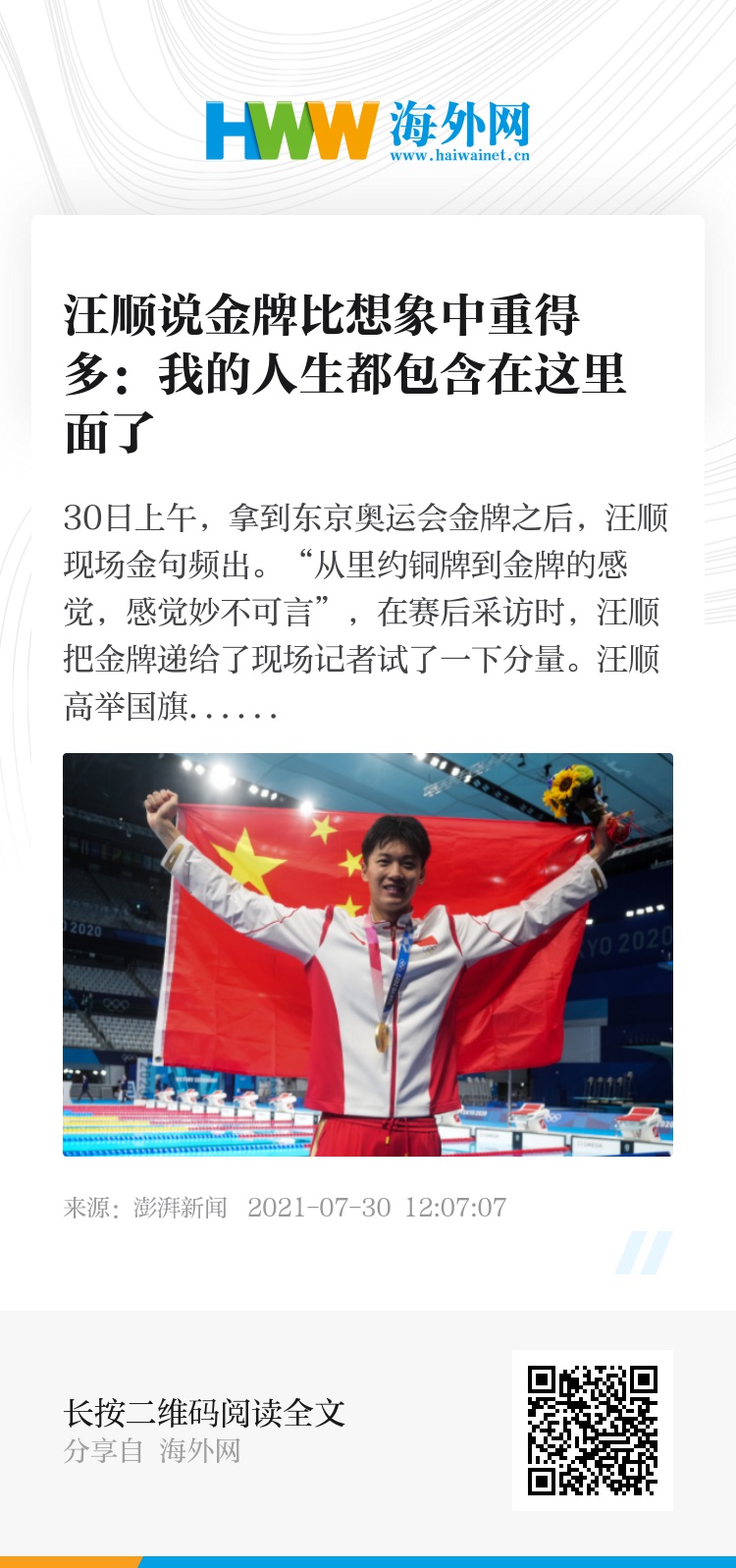 30日上午,拿到东京奥运会金牌之后,汪顺现场金句频出。