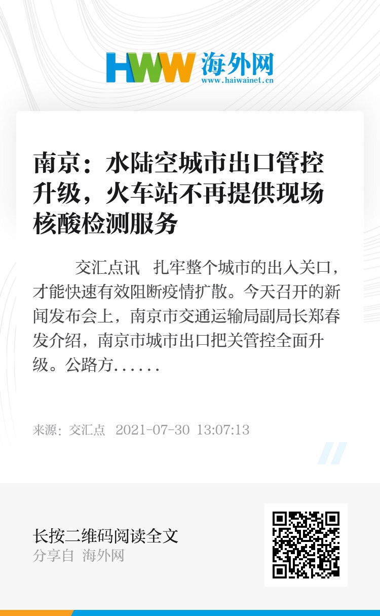 铁路方面,铁路南京南站、南京火车站共查验27万人,劝返3700人,并为9.7万旅客提供了应急核酸检测服务,通过铁路离宁旅客到昨天为止比平时下降超过80%。另外,为防范人员聚集风险,从今日0时起,南京火车站不再提供现场核酸检测服务,具体见南京发布相关通告。