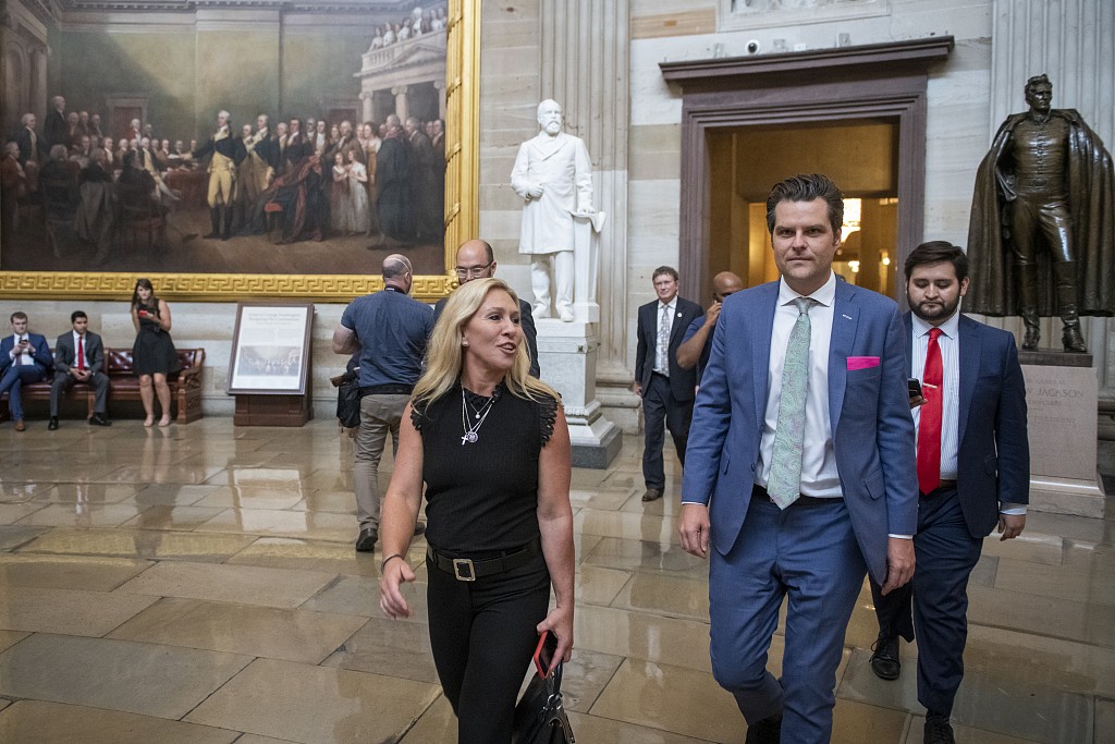 当地时间7月29日,在美国华盛顿,众多未带口罩共和党国会议员前往国会大厦的参议院,集体抗议国会医生要求恢复众议院"强制戴口罩"的要求。图片来源:人民视觉