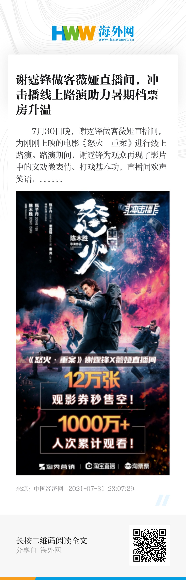 7月30日晚,谢霆锋做客薇娅直播间,为刚刚上映的电影《怒火・重案》进行线上路演。路演期间,谢霆锋为观众再现了影片中的文戏微表情、打戏基本功,直播间欢声笑语,吸引了超1000万观众围观,12万张观影资格券一售而空。
