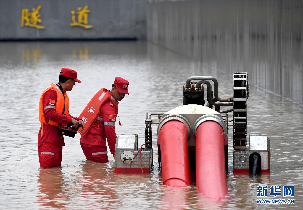 7月22日,来自中国安能南昌救援基地的救援人员在郑州市京广南路隧道进行排涝作业。新华社记者 李安 摄