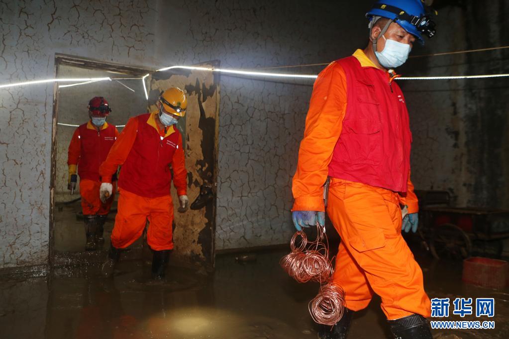 在郑州市二七区一社区的楼房地下室,来自浙江金华的援豫电力抢修人员准备前往配电房抢修(7月28日摄)。新华社记者 许雅楠 摄
