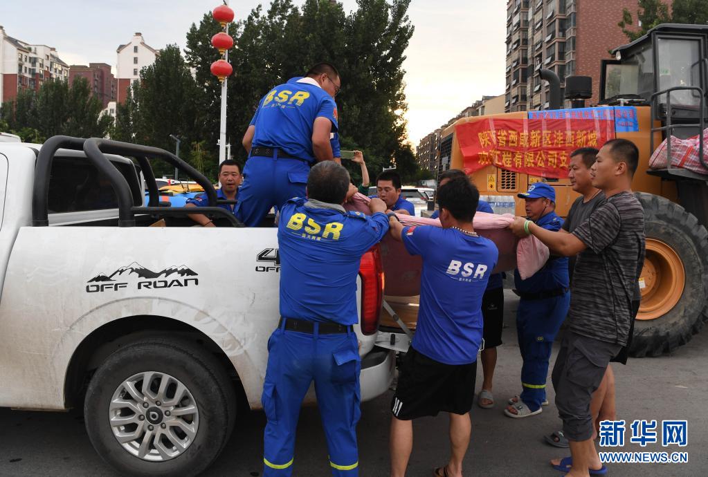 7月27日,蓝天救援队队员在卫辉市将一名行动不便的老人抬到车上。新华社记者 张浩然 摄