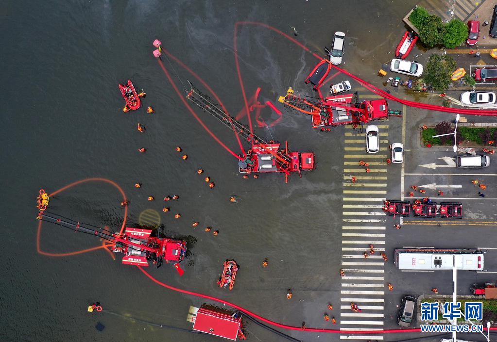 7月28日,消防救援人员在卫辉城区进行排涝作业(无人机照片)。新华社记者 李安 摄