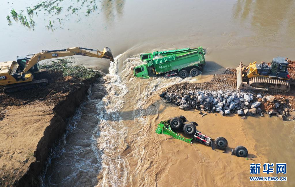 7月25日,满载石料的重型卡车被推入卫河鹤壁市浚县新镇镇彭村段的决口处(无人机照片)。新华社记者 张浩然 摄