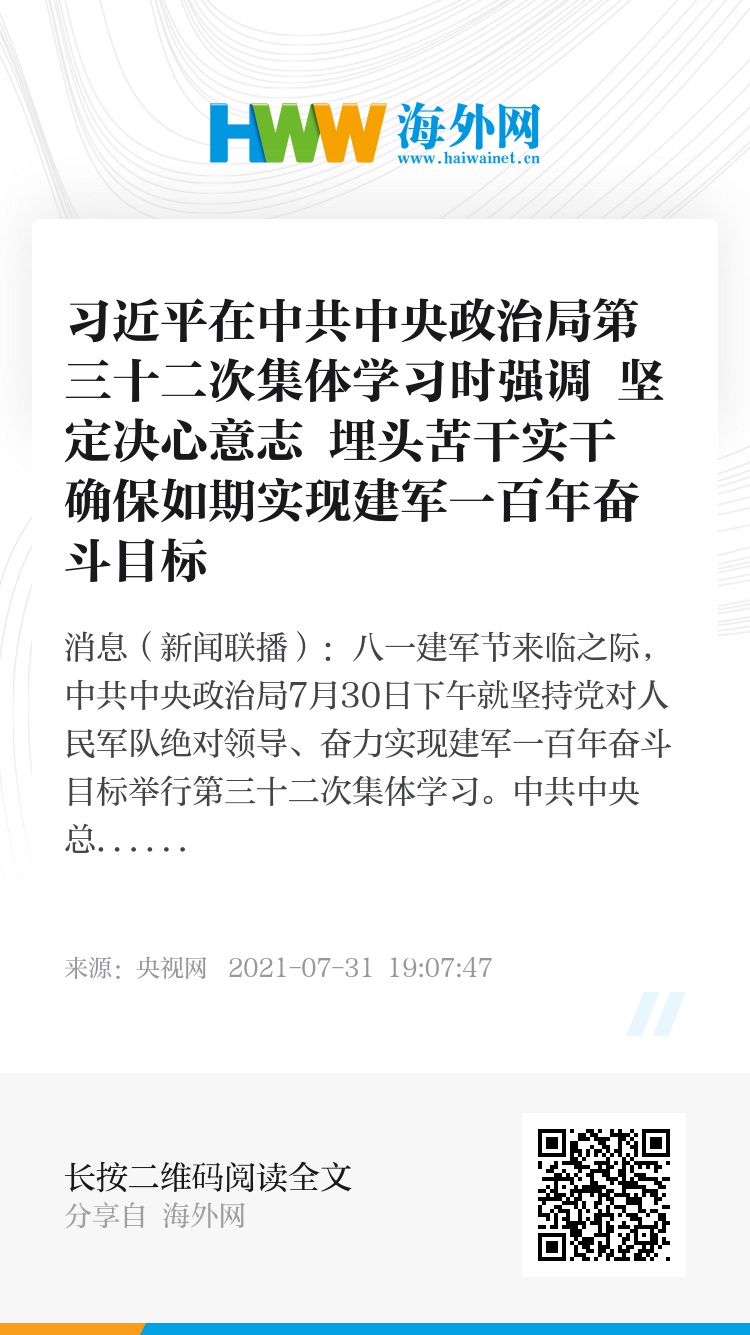 央视网消息(新闻联播):八一建军节来临之际,中共中央政治局7月30日下午就坚持党对人民军队绝对领导、奋力实现建军一百年奋斗目标举行第三十二次集体学习。中共中央总书记习近平在主持学习时强调,实现建军一百年奋斗目标,是党中央和中央军委把握强国强军时代要求作出的重大决策,是关系国家安全和发展全局的重大任务,是国防和军队现代化新“三步走”十分紧要的一步。要坚定决心意志,增强紧迫意识,埋头苦干实干,确保如期实现既定目标。