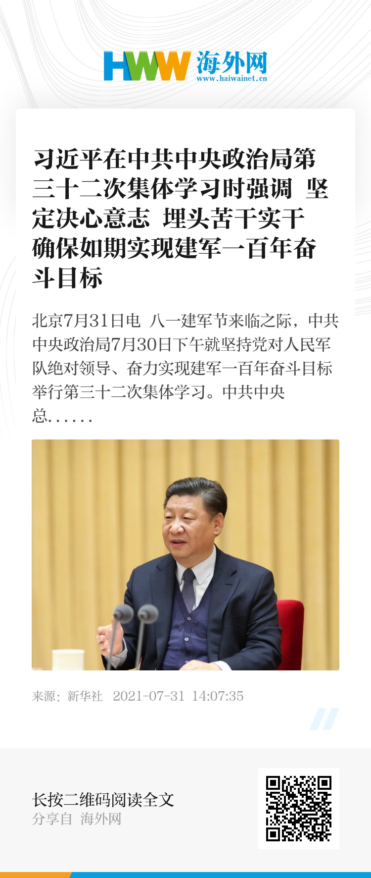 新华社北京7月31日电 八一建军节来临之际,中共中央政治局7月30日下午就坚持党对人民军队绝对领导、奋力实现建军一百年奋斗目标举行第三十二次集体学习。中共中央总书记习近平在主持学习时强调,实现建军一百年奋斗目标,是党中央和中央军委把握强国强军时代要求作出的重大决策,是关系国家安全和发展全局的重大任务,是国防和军队现代化新“三步走”十分紧要的一步。要坚定决心意志,增强紧迫意识,埋头苦干实干,确保如期实现既定目标。