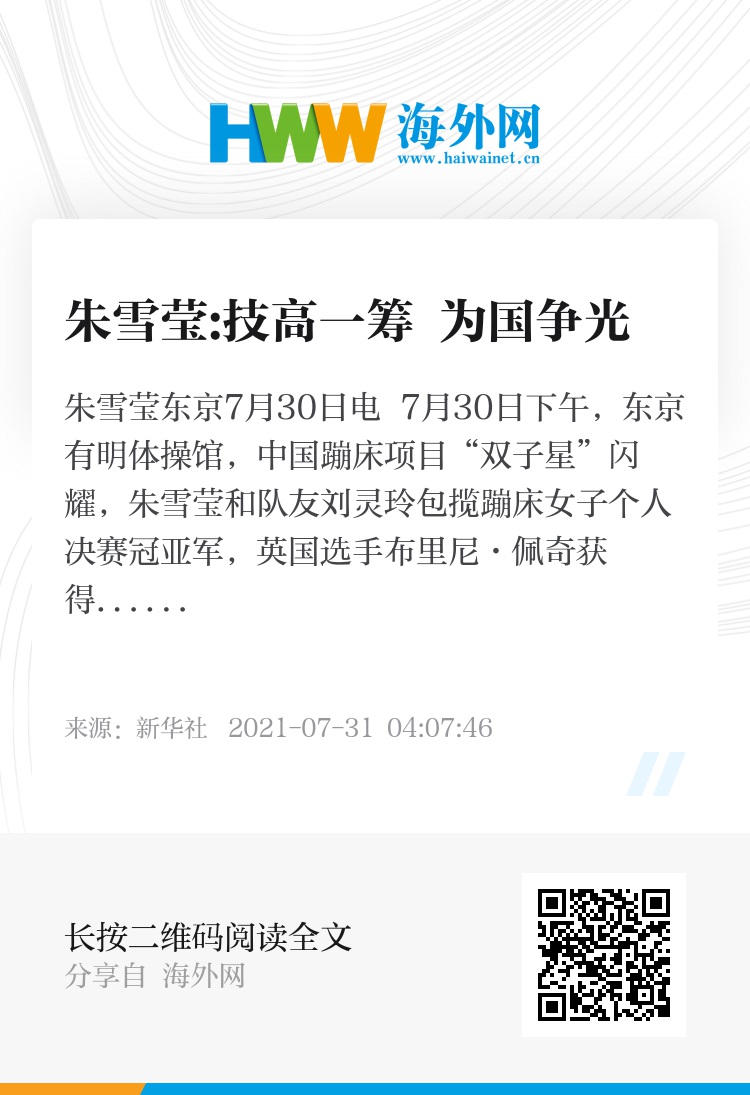 新华社东京7月30日电 7月30日下午,东京有明体操馆,中国蹦床项目“双子星”闪耀,朱雪莹和队友刘灵玲包揽蹦床女子个人决赛冠亚军,英国选手布里尼·佩奇获得铜牌。