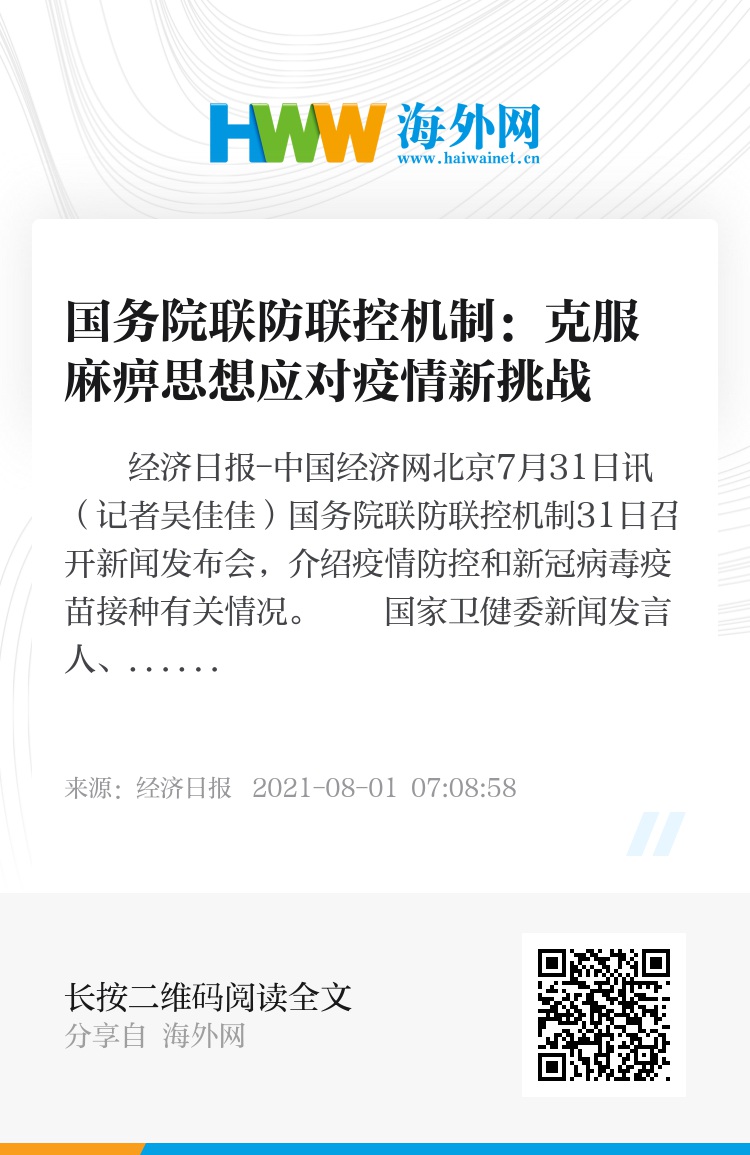 经济日报-中国经济网北京7月31日讯(记者吴佳佳)国务院联防联控机制31日召开新闻发布会,介绍疫情防控和新冠病毒疫苗接种有关情况。