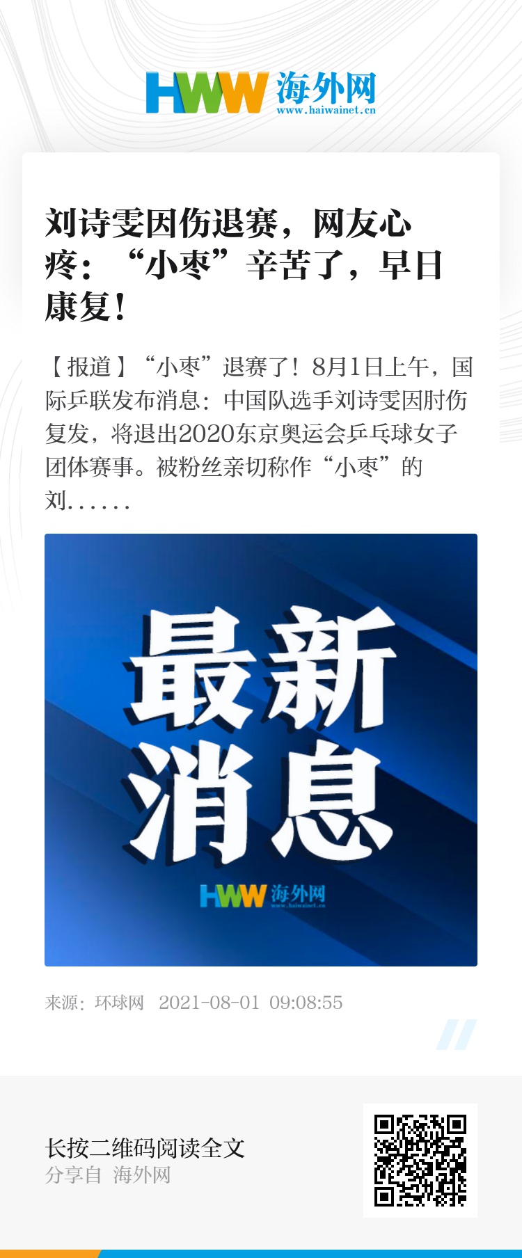 【环球网报道】“小枣”退赛了!8月1日上午,国际乒联发布消息:中国队选手刘诗雯因肘伤复发,将退出2020东京奥运会乒乓球女子团体赛事。被粉丝亲切称作“小枣”的刘诗雯无缘接下来的比赛,不少网友加油鼓劲,祝她早日康复。