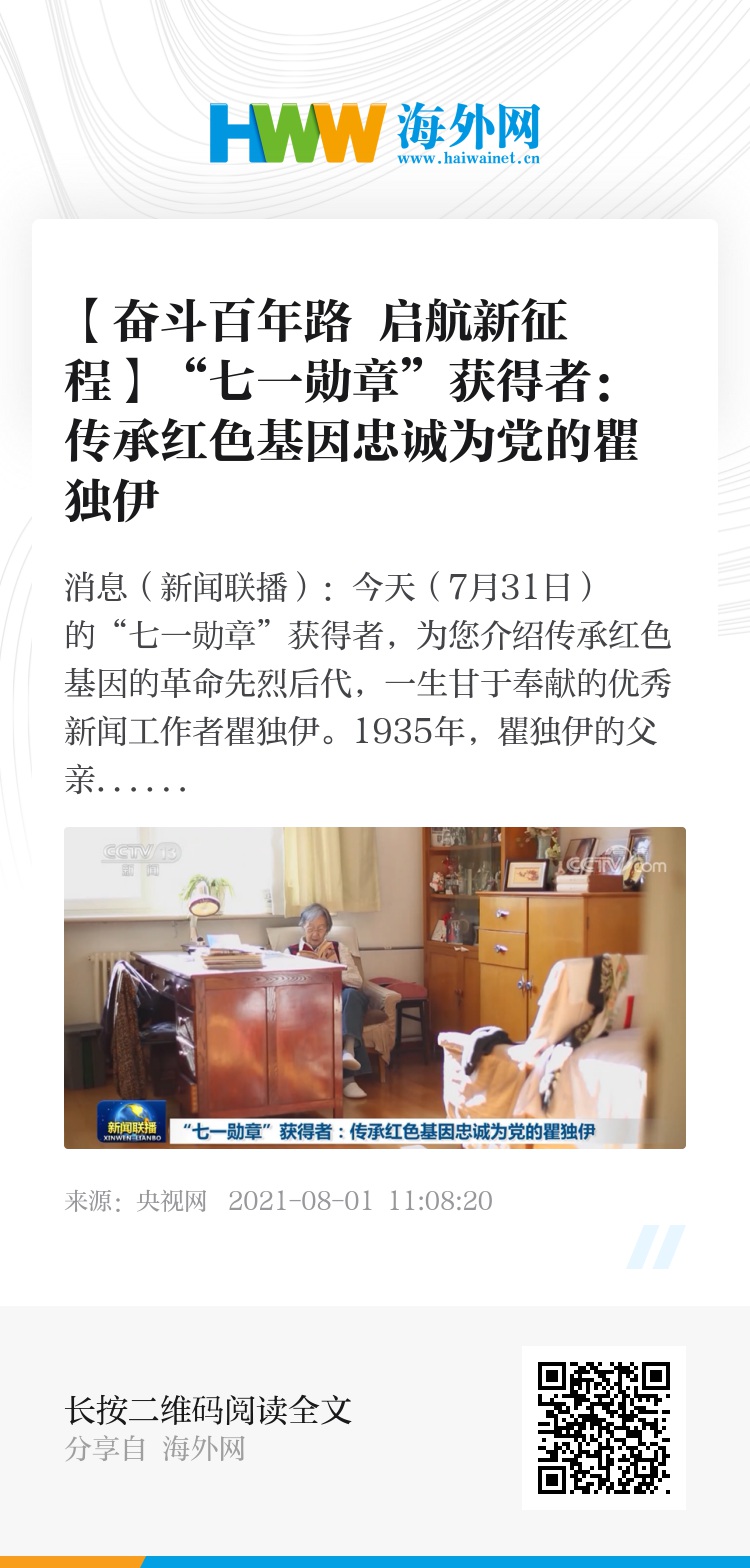 央视网消息(新闻联播):今天(7月31日)的“七一勋章”获得者,为您介绍传承红色基因的革命先烈后代,一生甘于奉献的优秀新闻工作者瞿独伊。