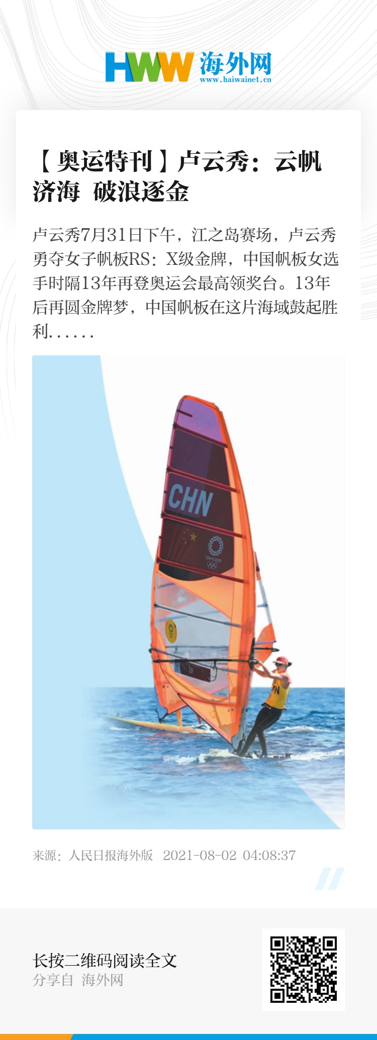 7月31日下午,江之岛赛场,卢云秀勇夺女子帆板RS:X级金牌,中国帆板女选手时隔13年再登奥运会最高领奖台。