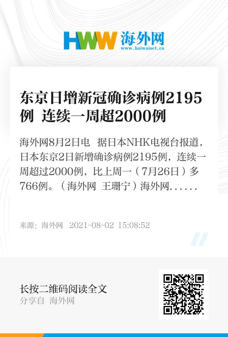 海外网8月2日电 据日本NHK电视台报道,日本东京2日新增确诊病例2195例,连续一周超过2000例,比上周一(7月26日)多766例。(海外网 王珊宁)
