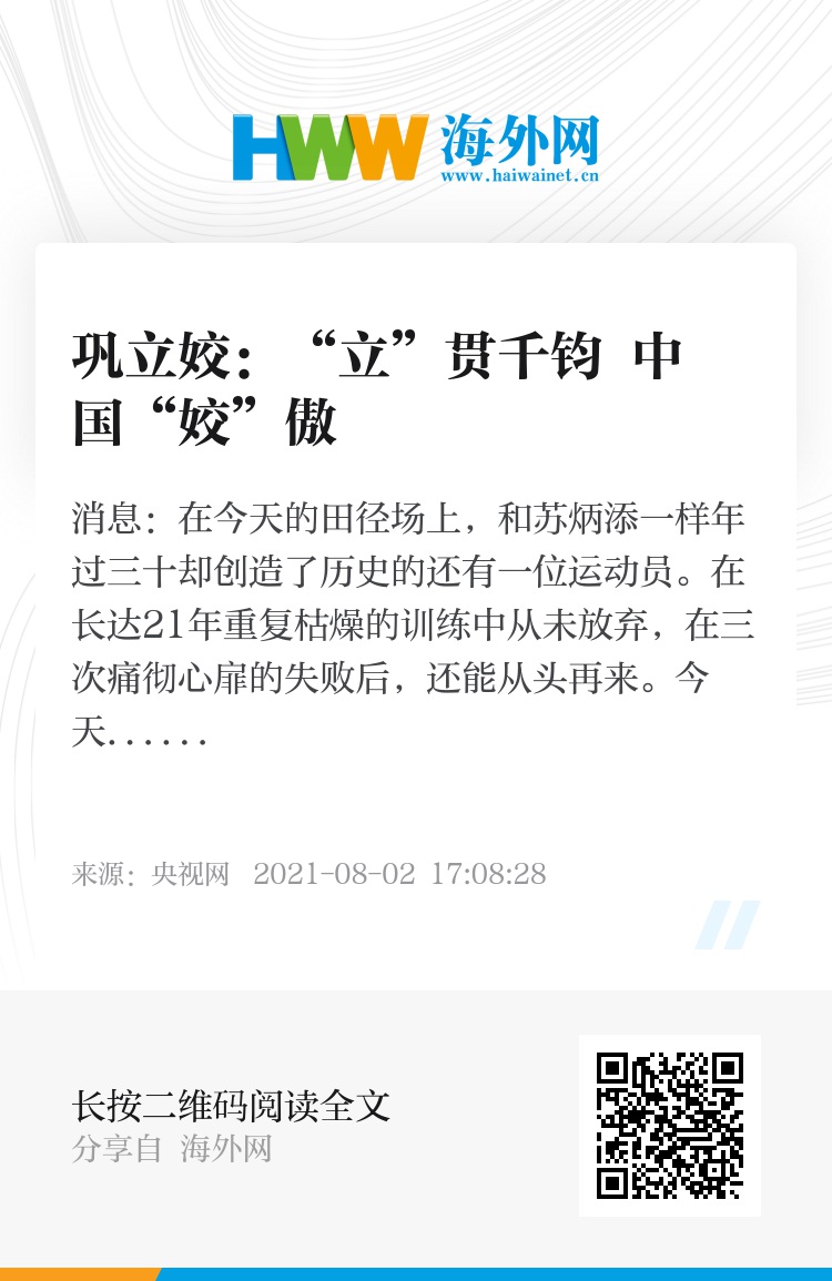 央视网消息:在今天的田径场上,和苏炳添一样年过三十却创造了历史的还有一位运动员。在长达21年重复枯燥的训练中从未放弃,在三次痛彻心扉的失败后,还能从头再来。今天,第四次征战奥运赛场的巩立姣,终于站在奥运赛场的最高领奖台上。