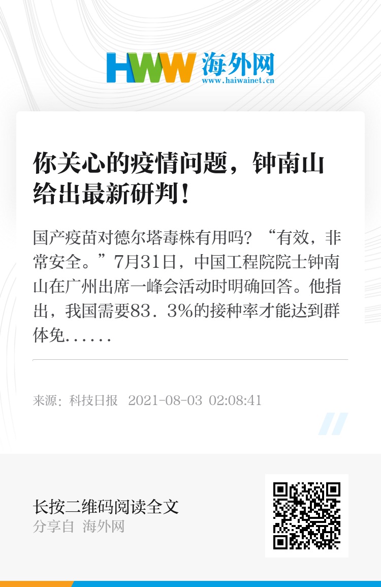 7月31日,中国工程院院士钟南山在广州出席一峰会活动时明确回答。他指出,我国需要83.3%的接种率才能达到群体免疫。为此,他特别呼吁大家要重视疫苗接种。