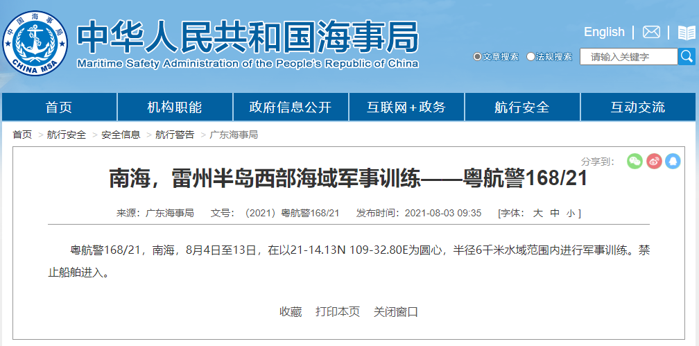 禁止驶入!南海雷州半岛西部海域4日至13日进行军事训练