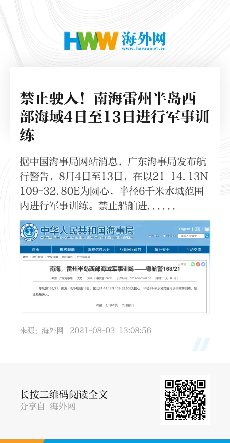 32182725,.禁止驶入!南海雷州半岛西部海域4日至13日进行军事训练,.2021-08-03 13:27:56,.204516,.扈嘉翼、胡敏