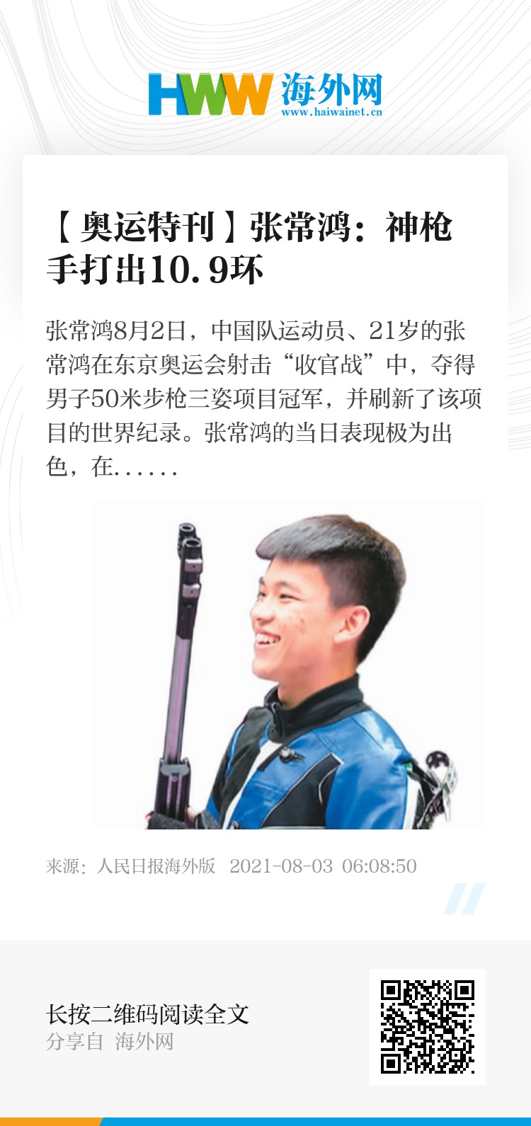 8月2日,中国队运动员、21岁的张常鸿在东京奥运会射击“收官战”中,夺得男子50米步枪三姿项目冠军,并刷新了该项目的世界纪录。