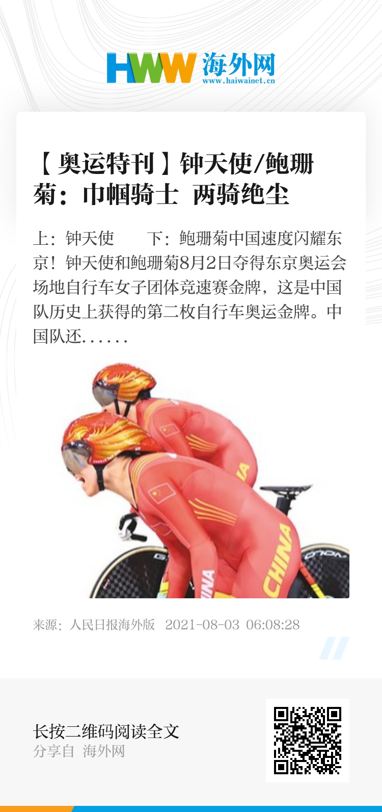 中国速度闪耀东京!钟天使和鲍珊菊8月2日夺得东京奥运会场地自行车女子团体竞速赛金牌,这是中国队历史上获得的第二枚自行车奥运金牌。中国队还在第一轮比赛中打破该项目世界纪录。