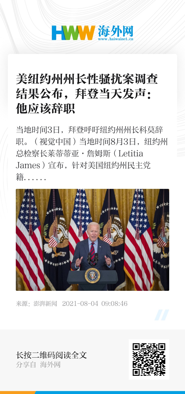 报告发布后,拜登已表态呼吁纽约州州长科莫辞职。据美国消费者新闻与商业频道(CNBC)报道,拜登于当日就此事在接受记者采访表示,“他应该辞职。”据悉,美国国会众议院议长佩洛西、纽约市市长比尔·德布拉西奥以及至少55名纽约州参议员也已于当日呼吁科莫辞职。