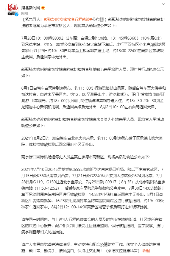 2021年7月10日20:45孟某乘9C6555次航班到达南京禄口机场,随后至南京玄武区。7月15日乘K360从南京到西安。7月21日乘G2240从西安到太原转乘G624到北京。7月28日乘G119、G150往返北京至泰安,7月29日乘 G9917( 8车3F)从北京朝阳站至承德南站(11:53-12:52),后乘私家车至师范学院教师公寓家中。7月30日14:05滴滴打车至承德附属医院南院区进行核酸检测,14:58花小猪打车返回家中无外出。8月1日高新区牛犇烤肉就餐,16:23使用滴滴打车至附属医院南院区进行核酸检测,约19:00乘私家车返回家中。8月2日12:00-14:00高新区冯营子镇后窑打边炉饭店就餐。