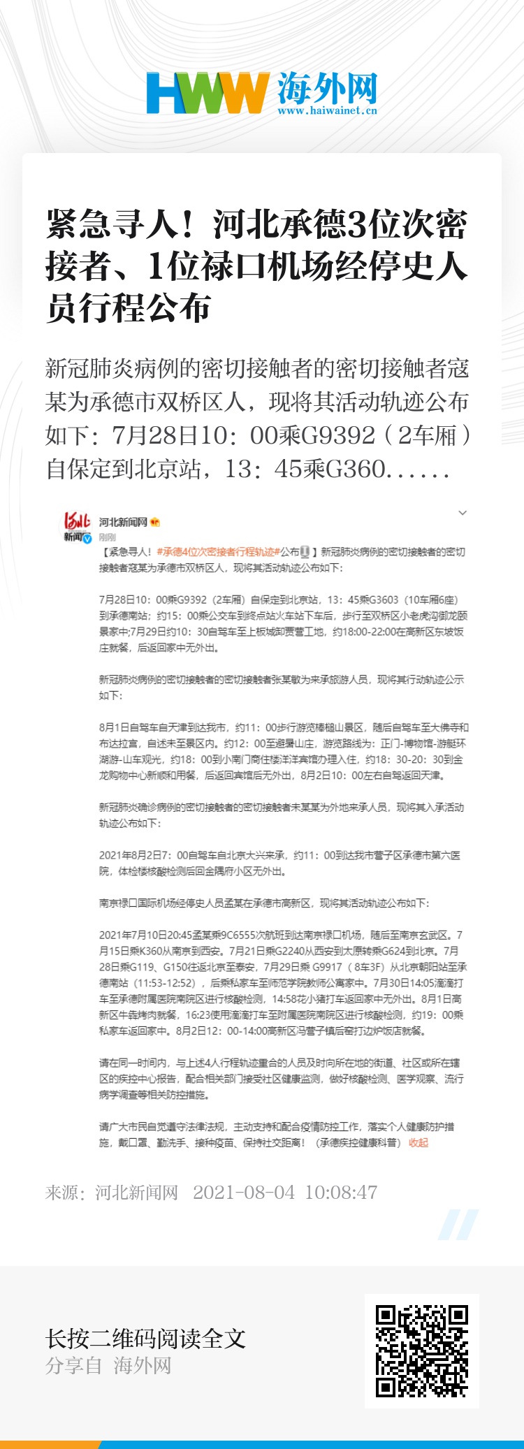 南京禄口国际机场经停史人员孟某在承德市高新区,现将其活动轨迹公布如下: