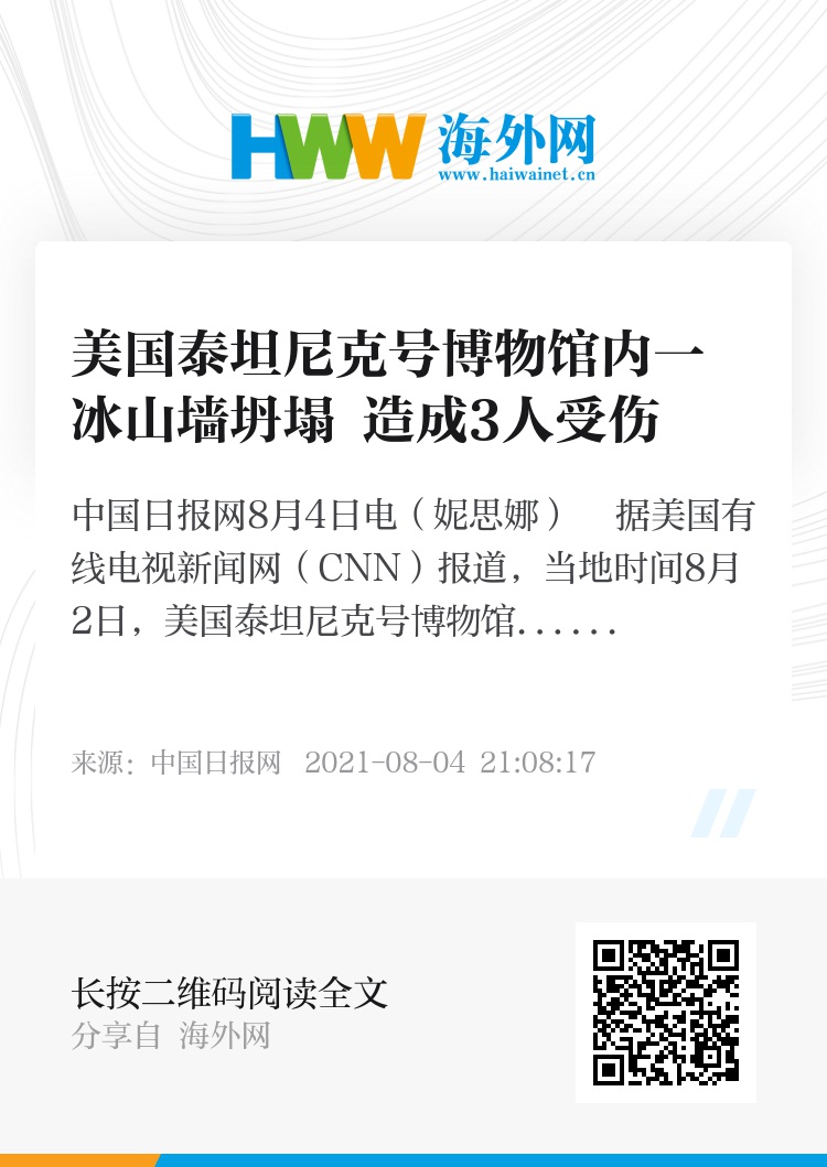 中国日报网8月4日电(妮思娜) 据美国有线电视新闻网(CNN)报道,当地时间8月2日,美国泰坦尼克号博物馆(Titanic Museum Attraction)的一面冰山墙坍塌,导致3名游客受伤。