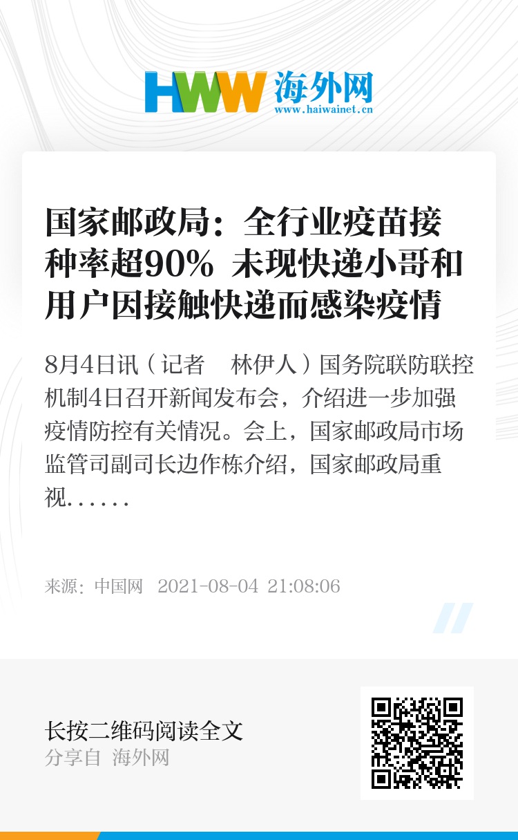 边作栋指出,快递小哥是前期安排接种疫苗的重点人群之一,国家邮政局按照国务院联防联控机制的工作部署,全力推进从业人员的疫苗接种工作。上半年,全行业疫苗接种率已经超过了90%。