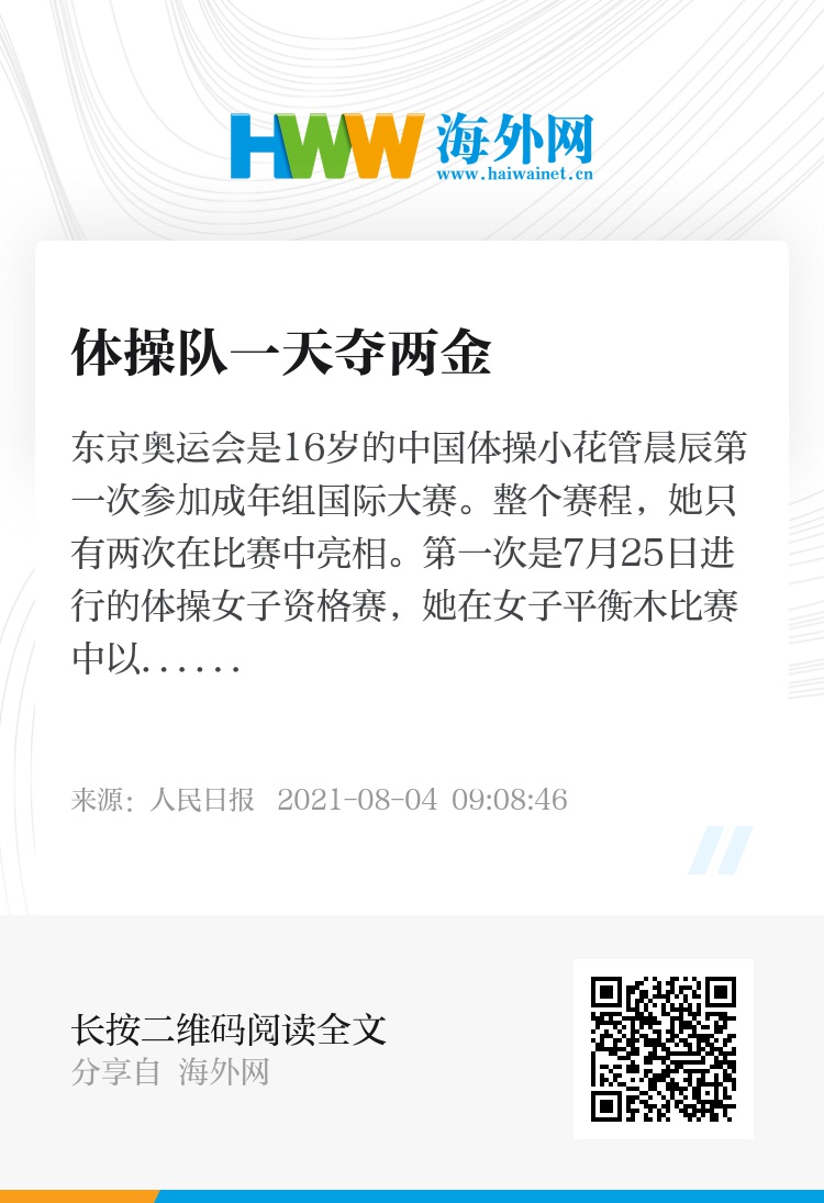 东京奥运会是16岁的中国体操小花管晨辰第一次参加成年组国际大赛。整个赛程,她只有两次在比赛中亮相。第一次是7月25日进行的体操女子资格赛,她在女子平衡木比赛中以14.933分的高分排名第一,晋级决赛。第二次是在8月3日进行的平衡木决赛中,最后一个出场的她获得14.633分,收获了金牌。