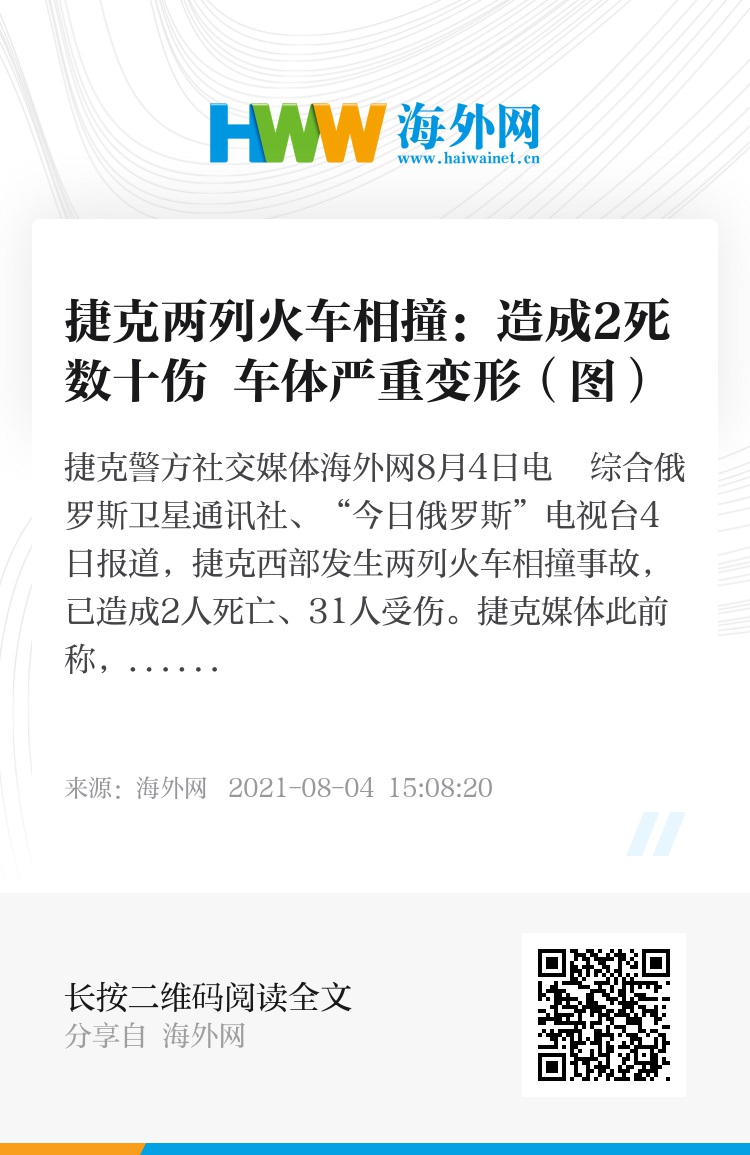 海外网8月4日电 综合俄罗斯卫星通讯社、“今日俄罗斯”电视台4日报道,捷克西部发生两列火车相撞事故,已造成2人死亡、31人受伤。捷克媒体此前称,至少50人受伤。