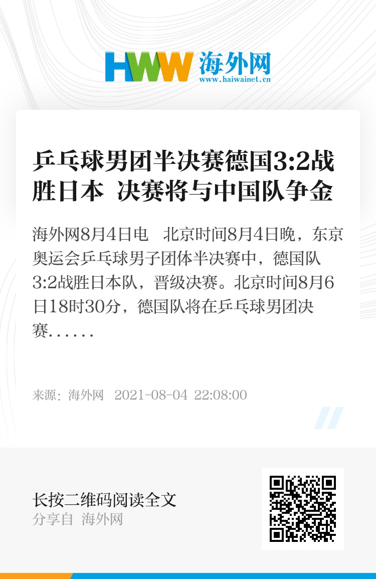 海外网8月4日电 北京时间8月4日晚,东京奥运会乒乓球男子团体半决赛中,德国队3:2战胜日本队,晋级决赛。北京时间8月6日18时30分,德国队将在乒乓球男团决赛中与中国队角逐金牌。(海外网 姚凯红)