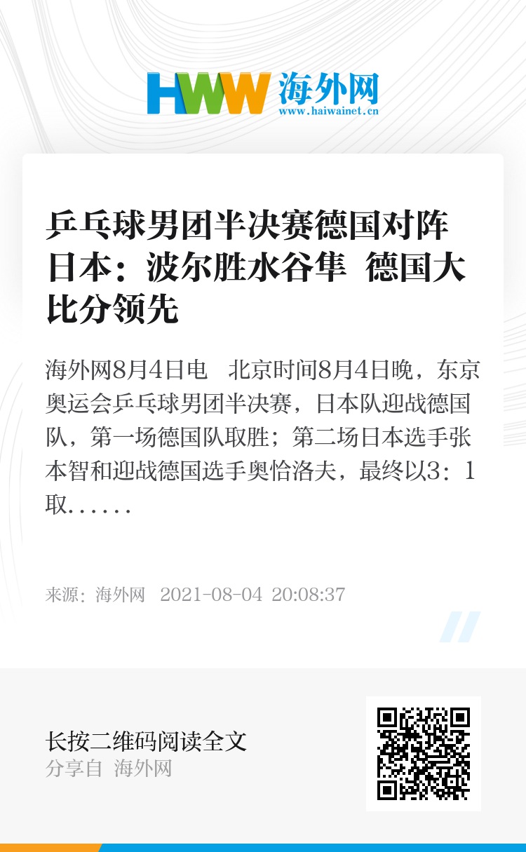 32184488,.乒乓球男团半决赛德国对阵日本:波尔胜水谷隼 德国大比分领先,.2021-08-04 20:46:37,.204008,.姚凯红、吴倩