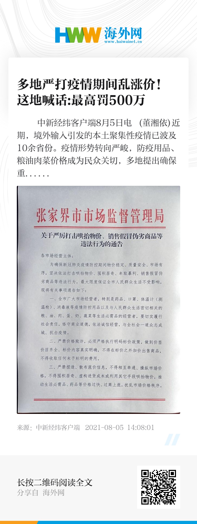 8月4日,湖北省市场监管局向全省各类经营者发布提醒告诫,维护市场价格秩序,防止各类价格违法行为发生,确保防疫物资及生活必需品价格稳定。