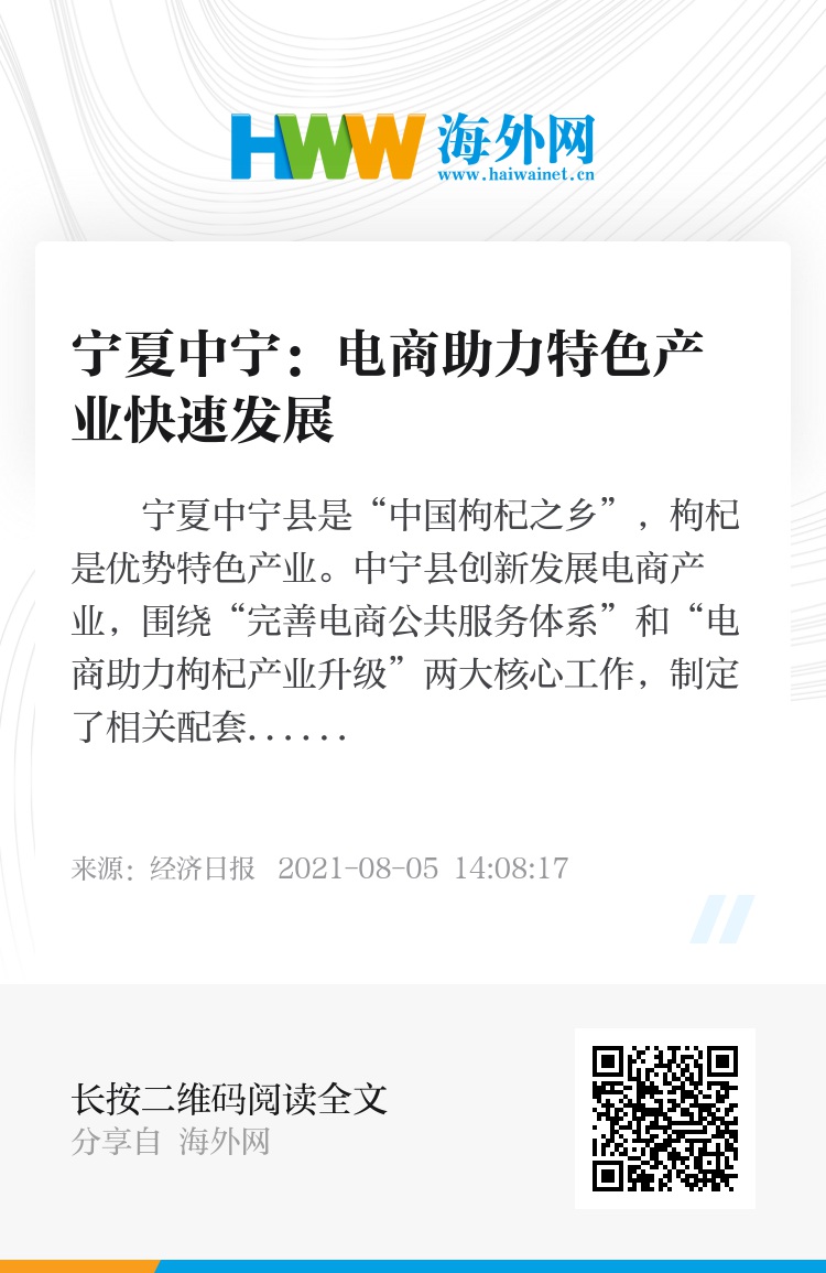 宁夏中宁县是“中国枸杞之乡”,枸杞是优势特色产业。中宁县创新发展电商产业,围绕“完善电商公共服务体系”和“电商助力枸杞产业升级”两大核心工作,制定了相关配套扶持政策,在基础设施建设、品牌培育、产品溯源、物流快递及财政、金融、税费等方面予以扶持,鼓励企业和个人积极发展电商业务。目前全县网商发展到3159家,带动就业1.04万人。