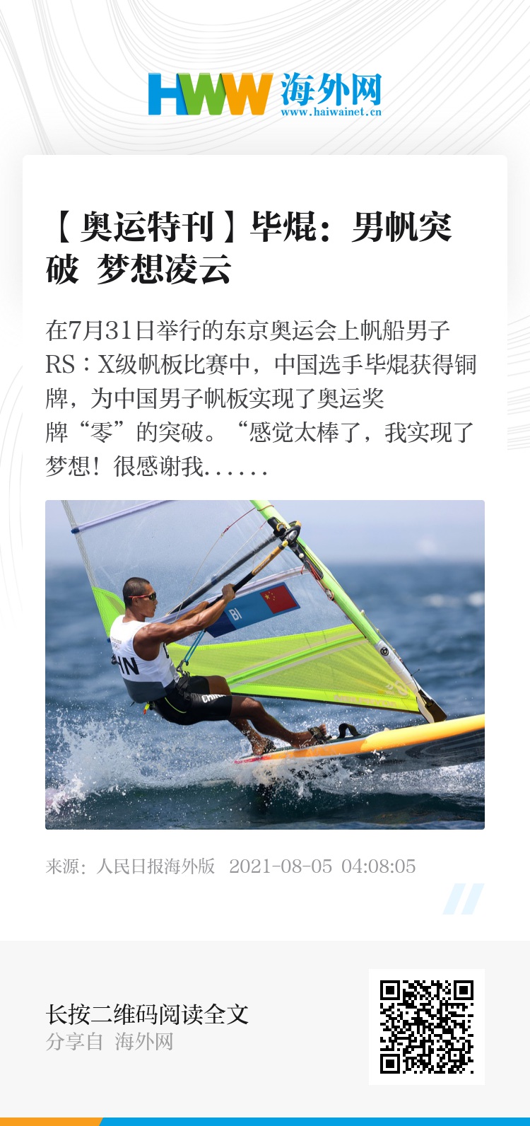 在7月31日举行的东京奥运会上帆船男子RS∶X级帆板比赛中,中国选手毕焜获得铜牌,为中国男子帆板实现了奥运奖牌“零”的突破。
